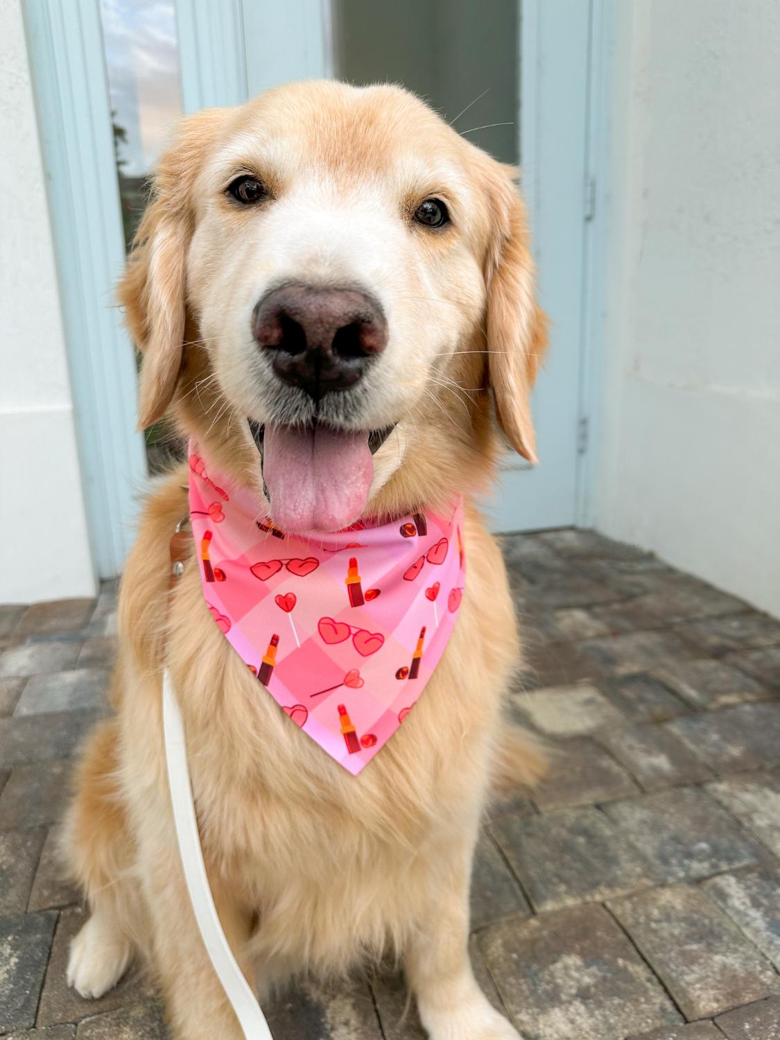 Heart glasses, lollipops, and lipstick on a fun gingham backdrop will have your pup ready to slay Galentines or Valentines. One side is the deep red and the other the bright blush pink. We love the girl bossy vibe.