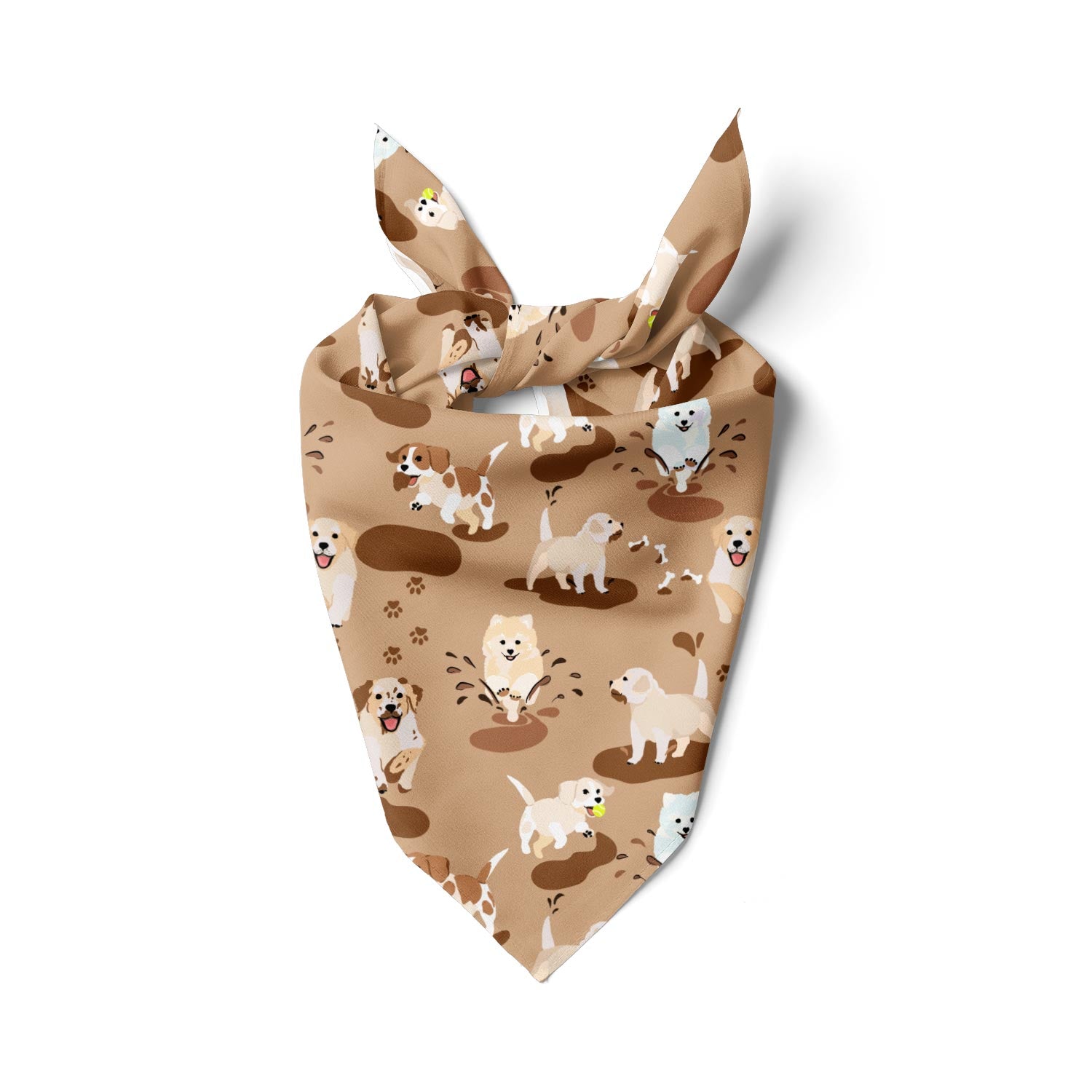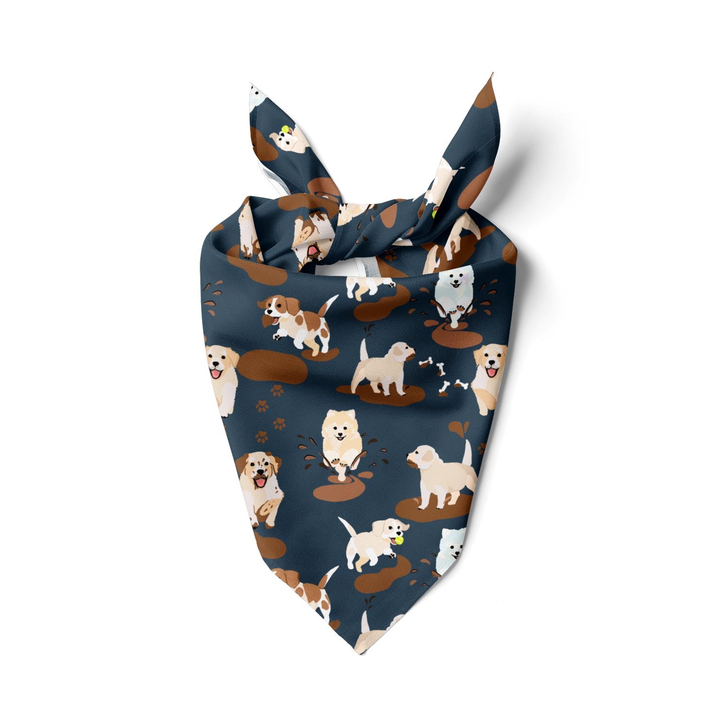 Happy puppies cavorting through mud puddles. This bandana reeks of fun and potentially shenanigans in your future. Color options are: dark blue/light blue, red/mud, orange/mud, and light blue/mud. This design was inspired by our friends @capone.and.maggie.plus4.